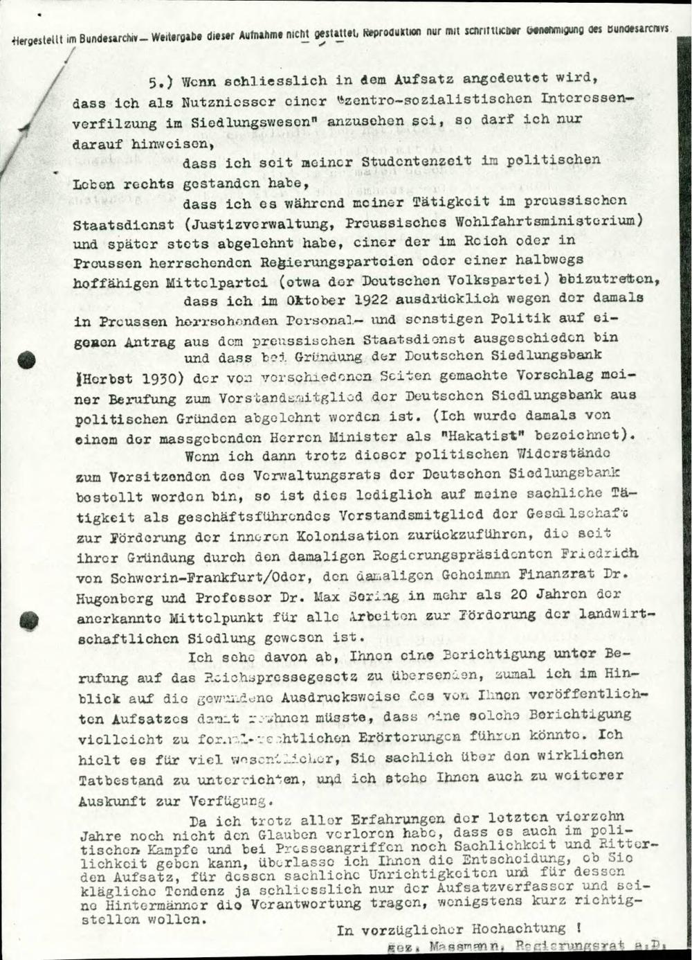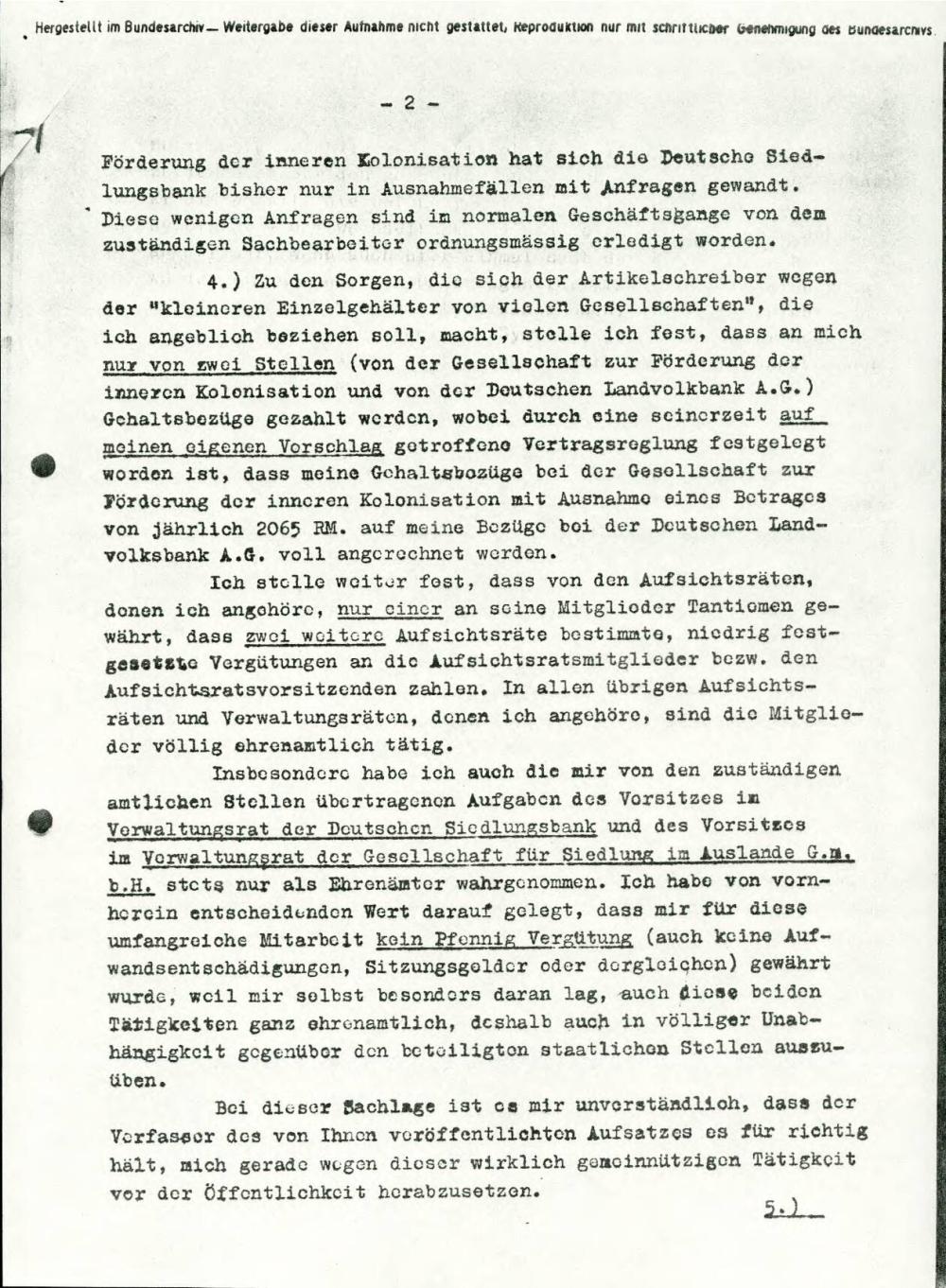 Kritičen odziv Karla Massmanna na članek v časopisu Deutsche Zeitung glede delovanja Deutschen Siedlungsbank.