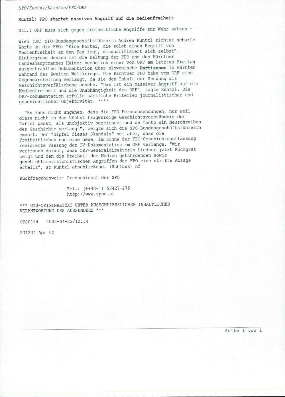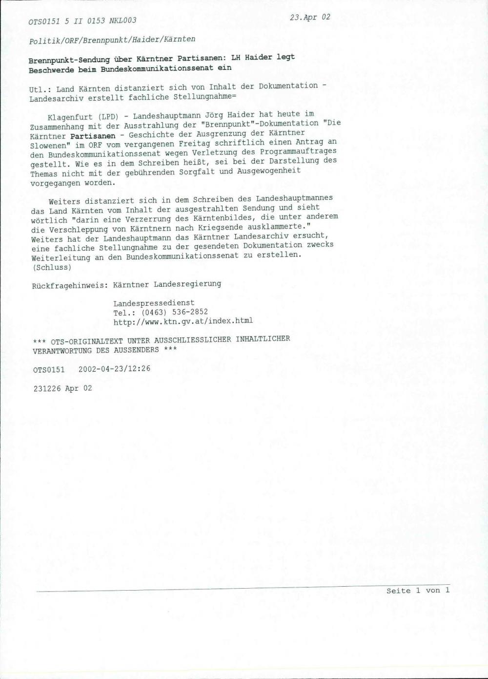 Brennpunkt-Sendung über Kärntner Partisanen: LH Haider legt Beschwerde beim Bundeskommumkationssenat ein