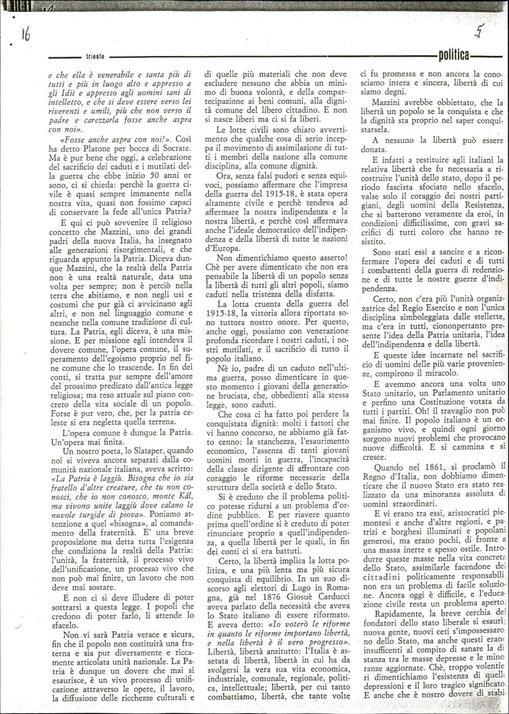 Esej Biagia Marina je refleksija o pomenu prve svetovne vojne za italijansko narodno zavest, o vlogi Trsta in o vrednotah domoljubja, svobode in solidarnosti, ki jih je vojna utrdila v italijanski družbi.