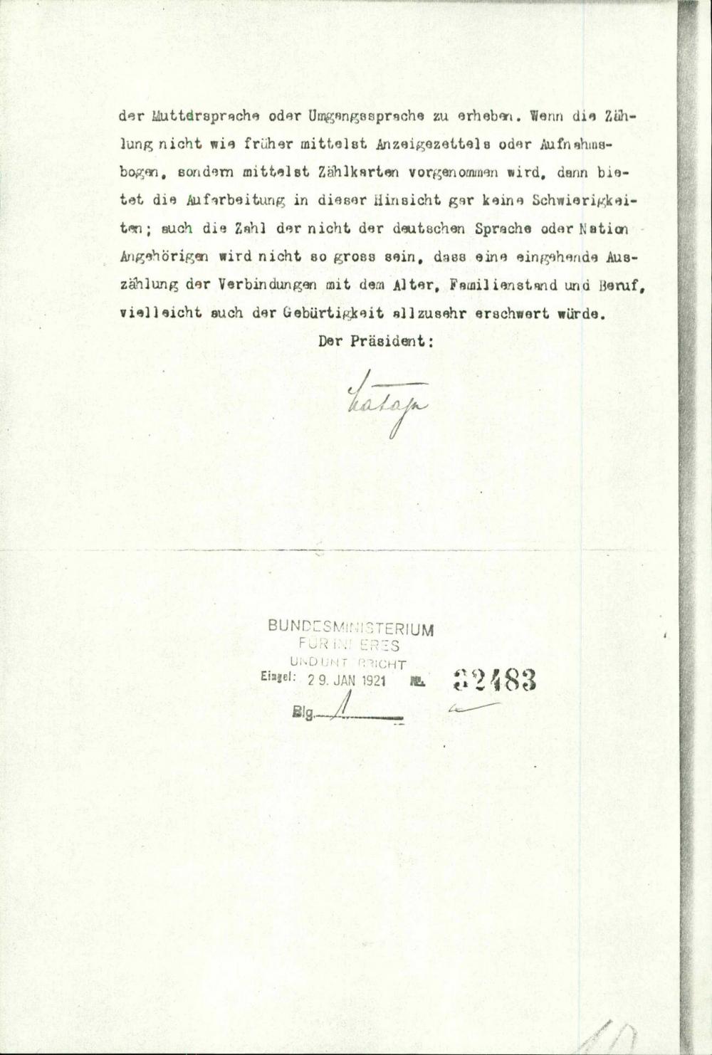 Dopis: Volkszählung 1921. Feststellung der slowakischen, beziehungsweise kroatischen Nationalität und Umgangssprache