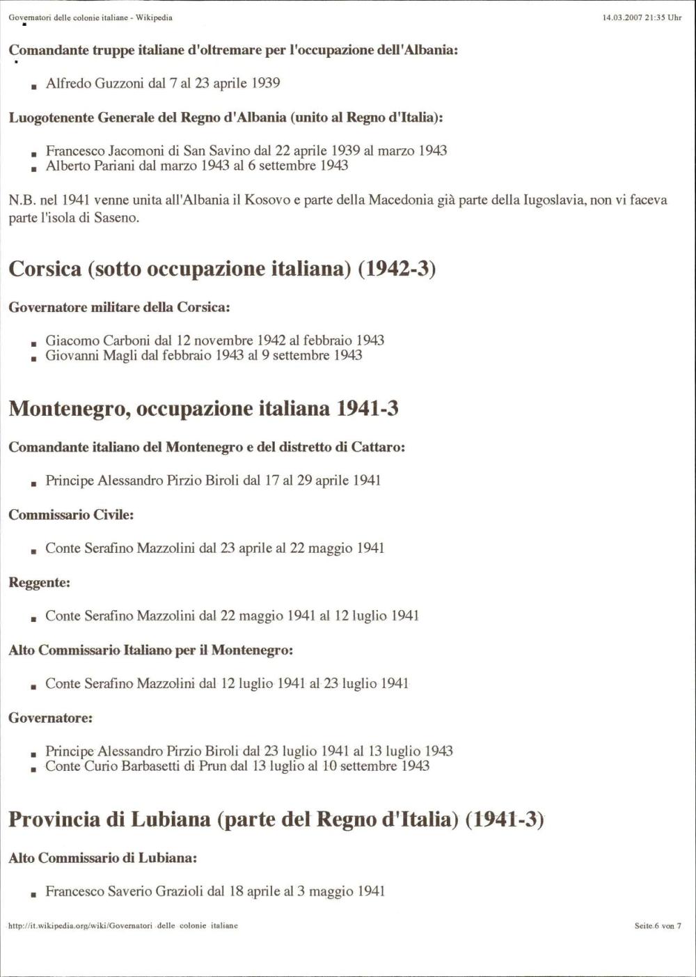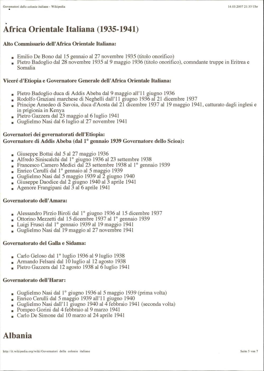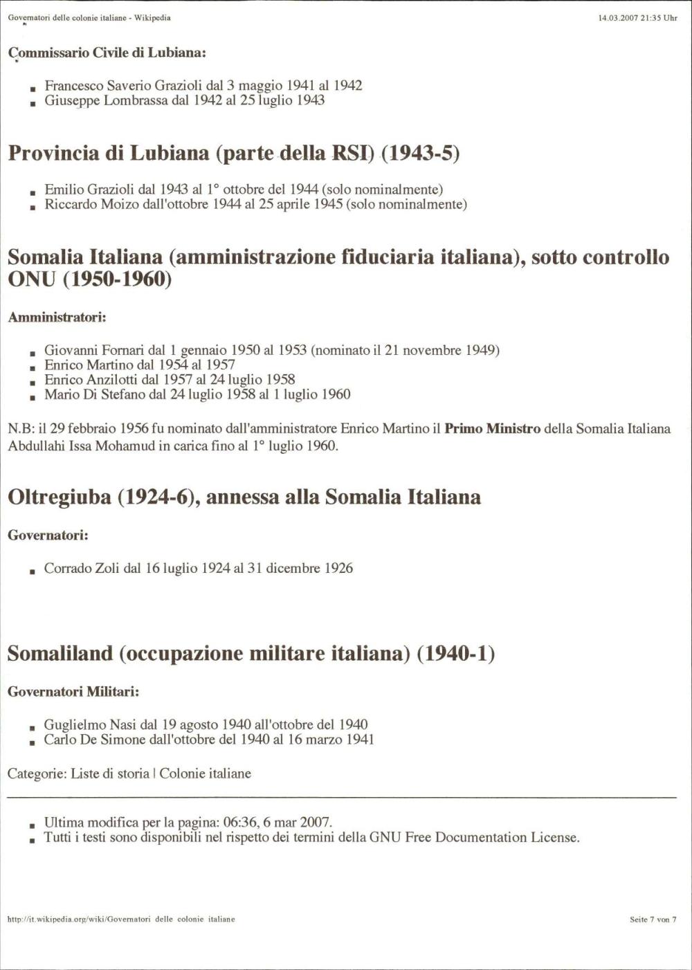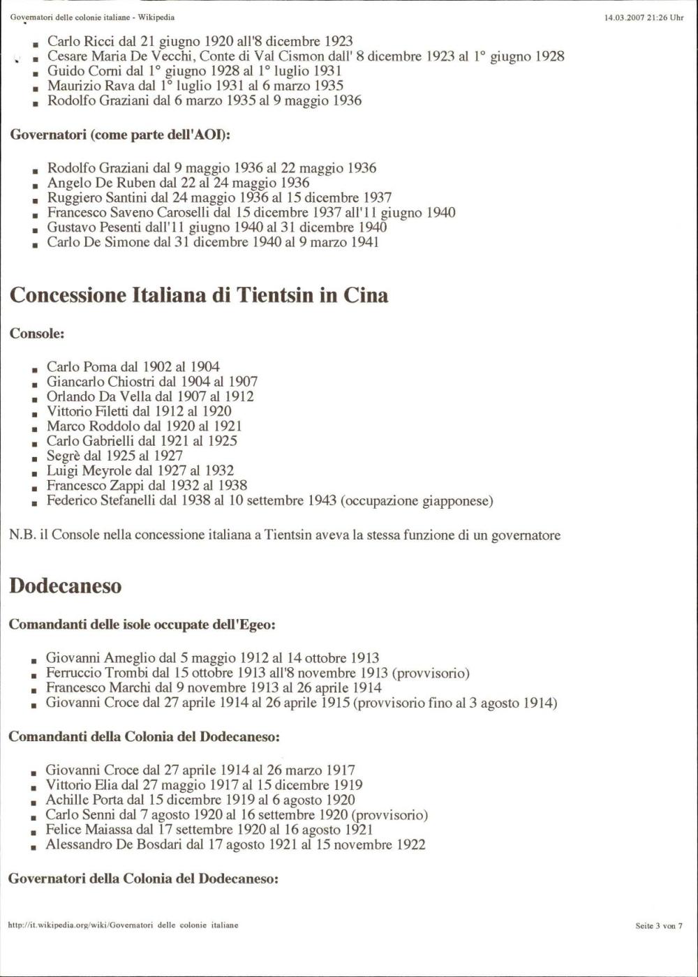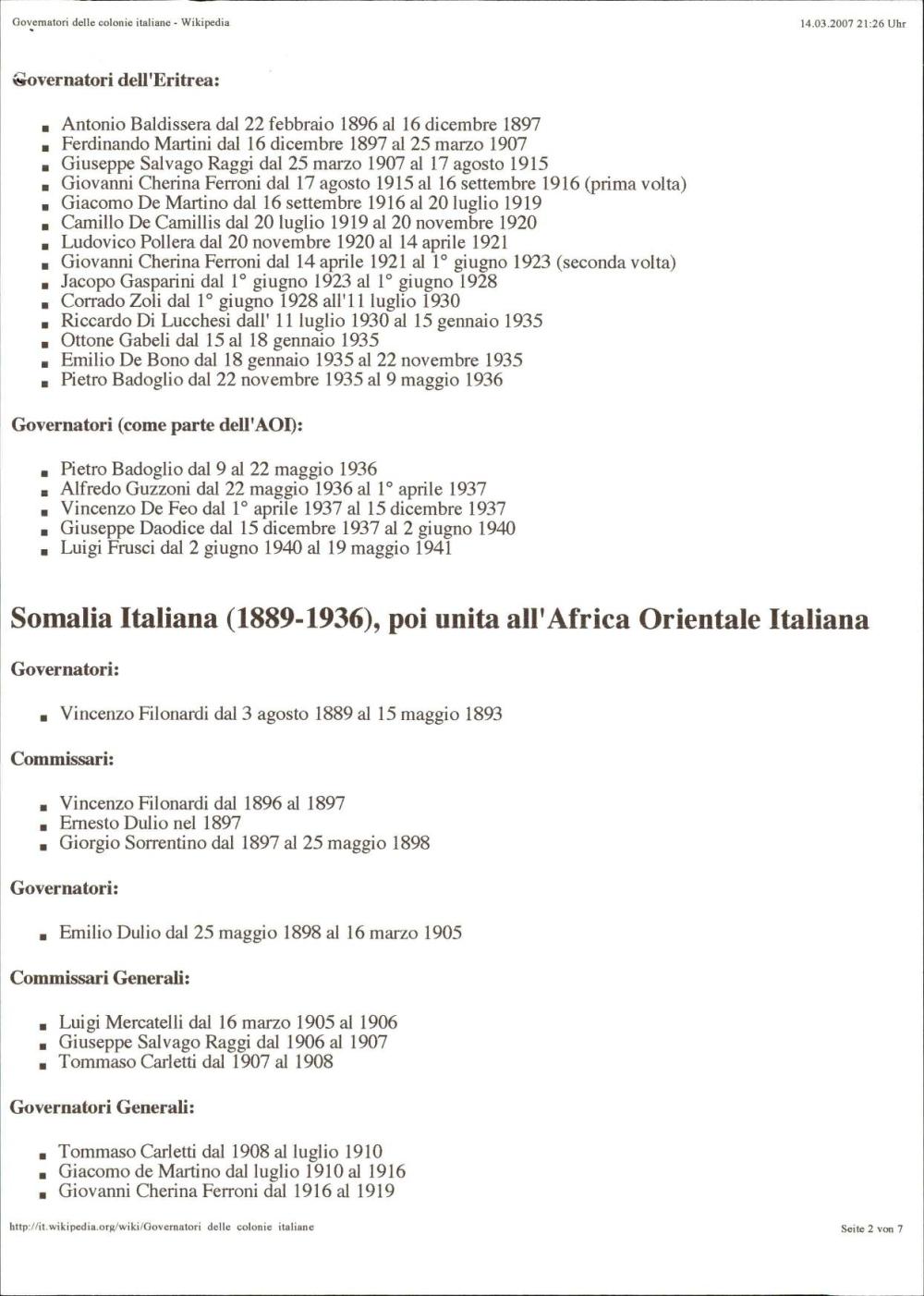 Podroben seznam vseh guvernerjev italijanskih kolonij od začetkov kolonializma v Eritreji leta 1870 do konca italijanske uprave v Somaliji leta 1960, vključno z okupiranimi ozemlji, kot so Ljubljana, Dodekanez, Albanija in Libija. Objavljeno na Wikipediji.