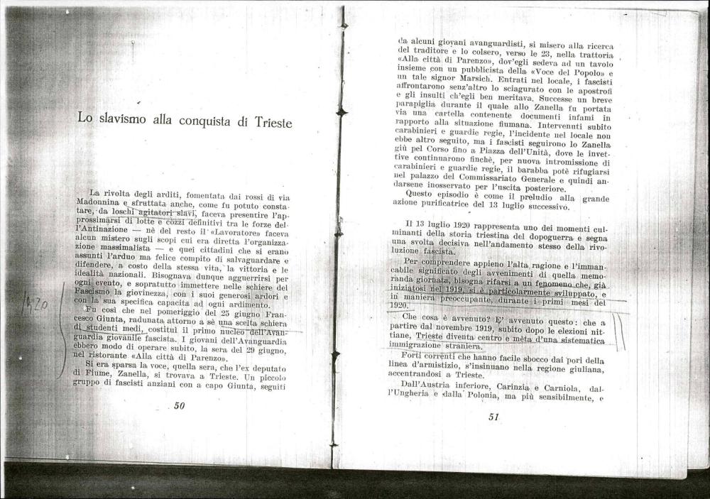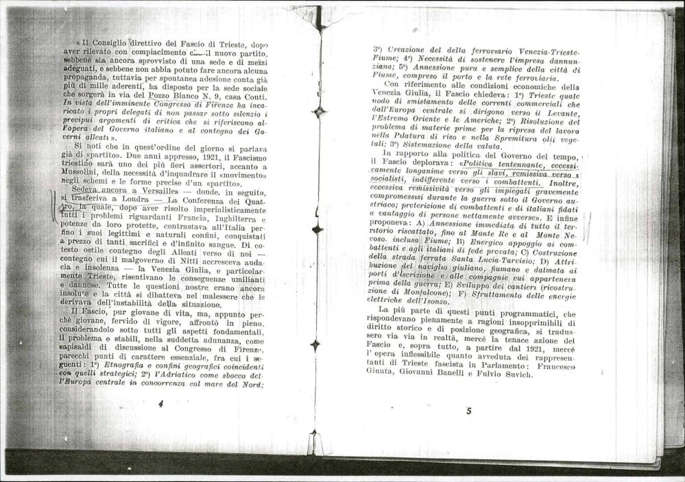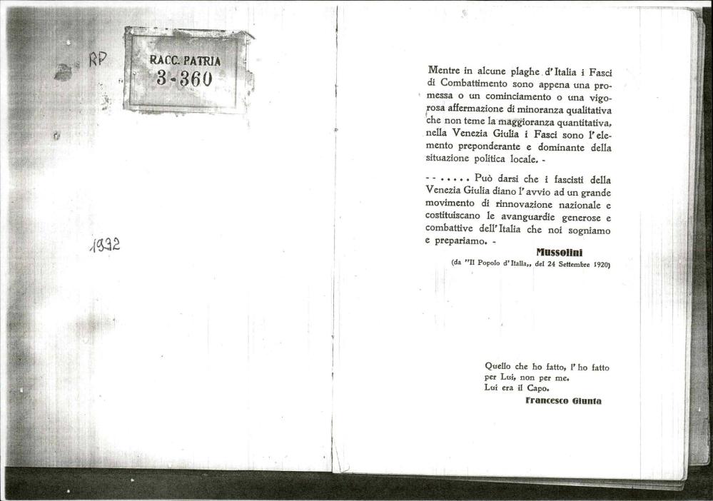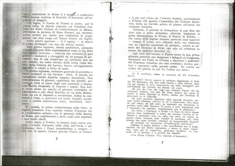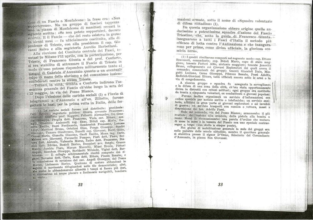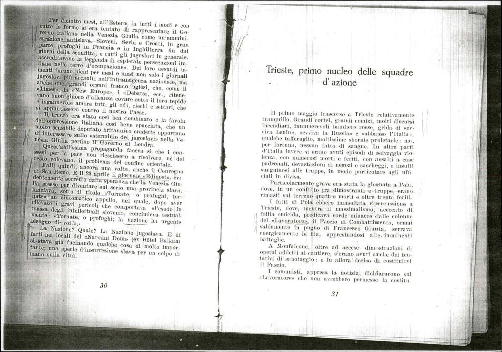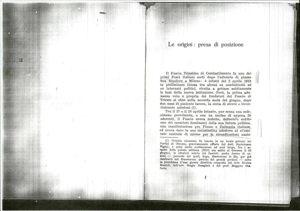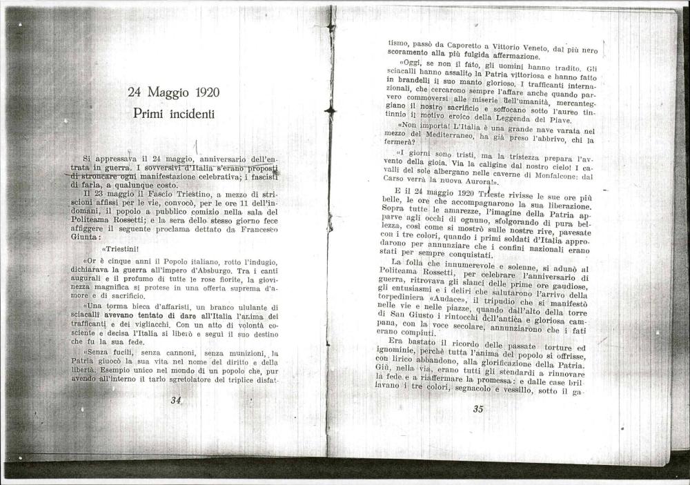 Knjiga opisuje vzpon fašističnega gibanja v Trstu in širši regiji Julijske krajine med letoma 1919 in 1920, poudarja njegovo organizacijo, konflikte z jugoslovanskimi in socialističnimi skupinami ter vrhunec v nasilnih dogodkih, kot je požig Narodnega doma, vse v kontekstu italijanskega nacionalizma in povojne politične nestabilnosti.