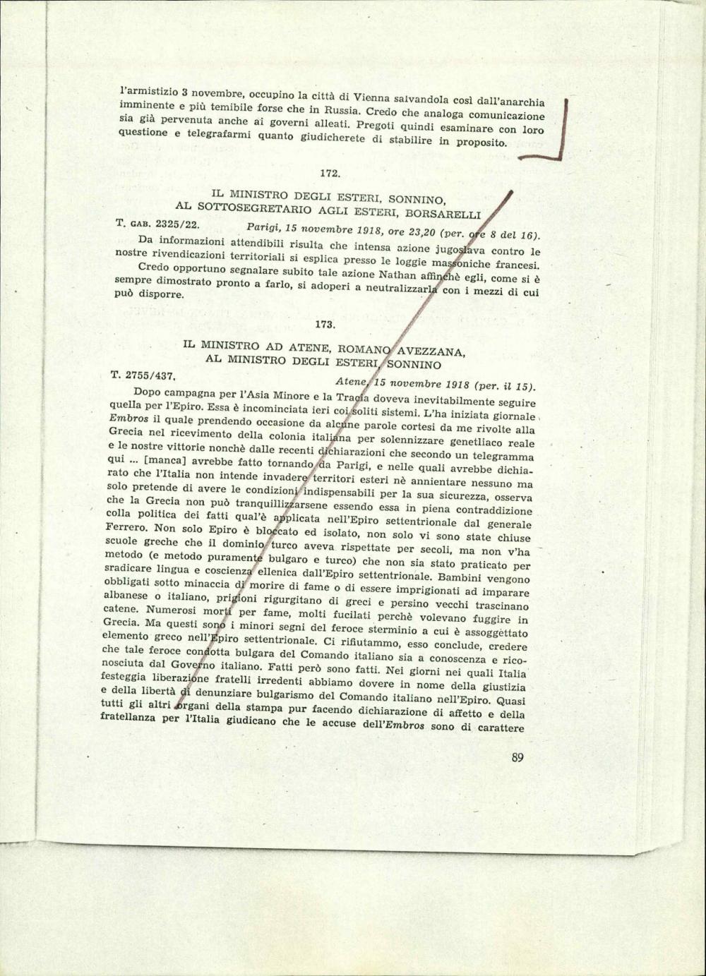 Il presidente del consiglio, Orlando, al ministro degli esteri, Sonnino, a Parigi