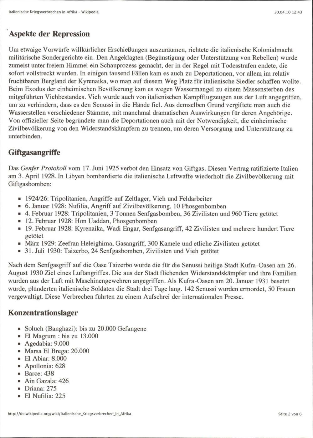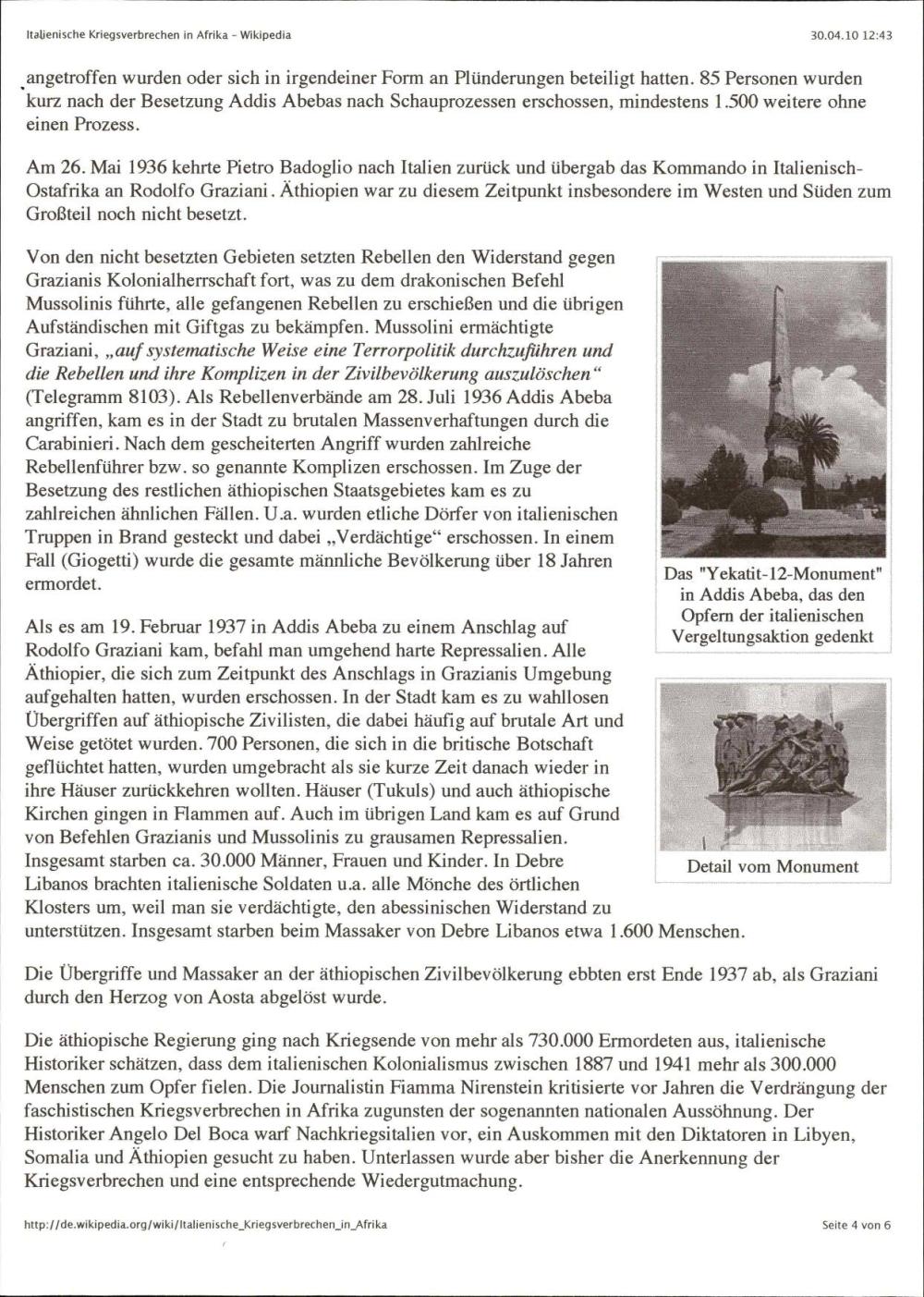 Članek opisuje italijanske vojne zločine v Libiji in Etiopiji med fašistično vladavino, vključno z uporabo strupenega plina, množičnimi poboji, deportacijami in koncentracijskimi taborišči.