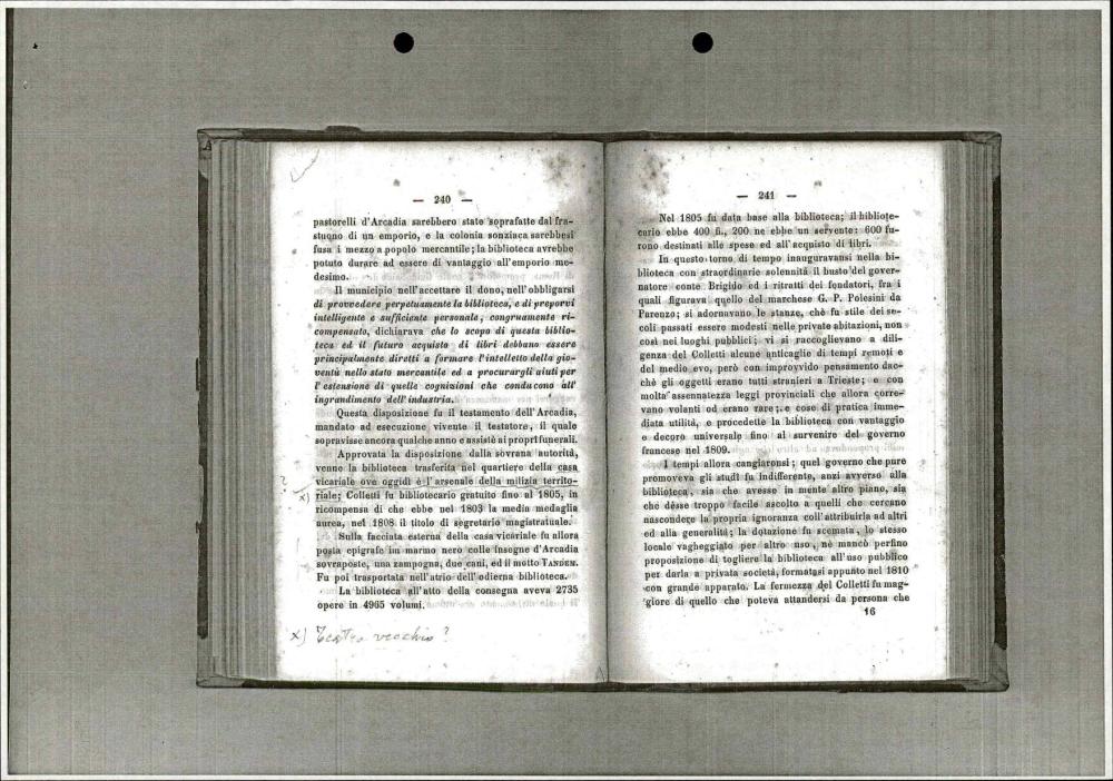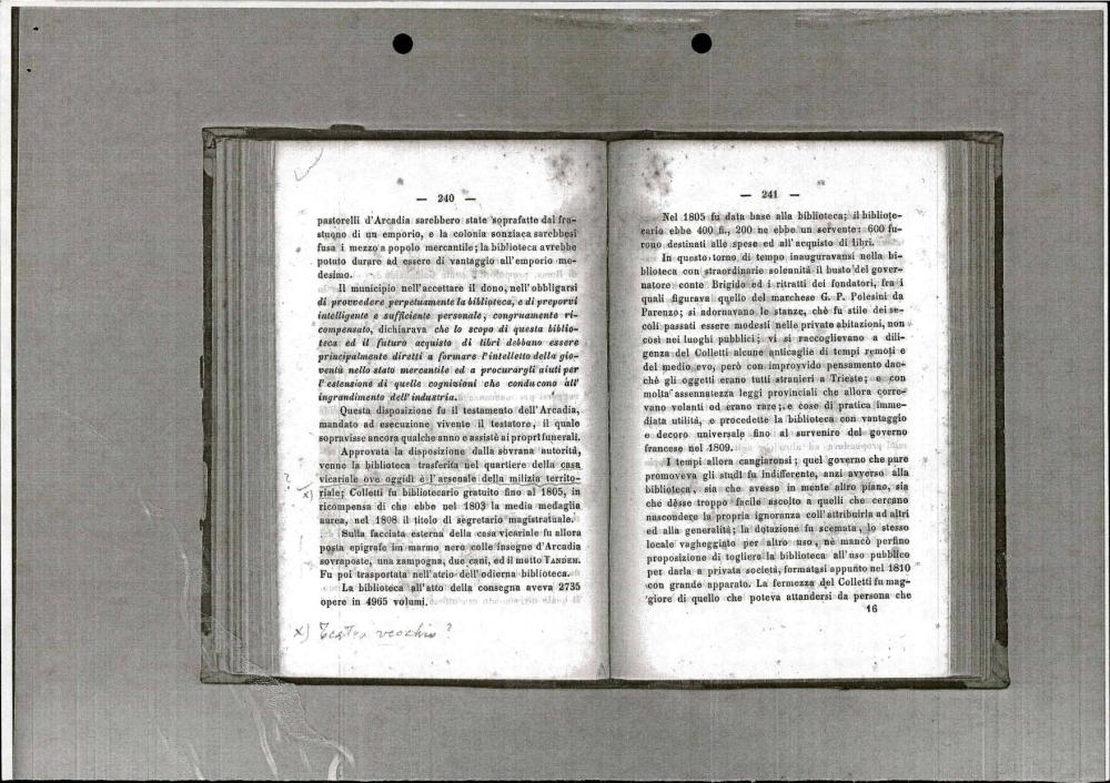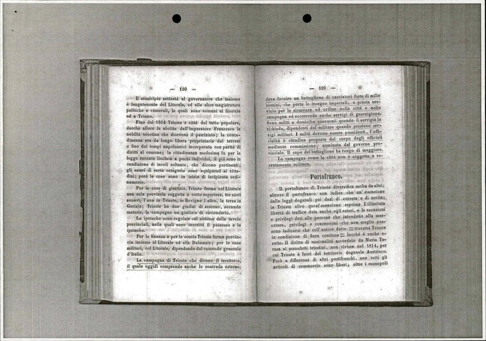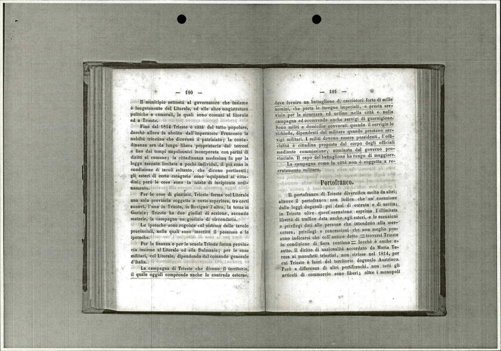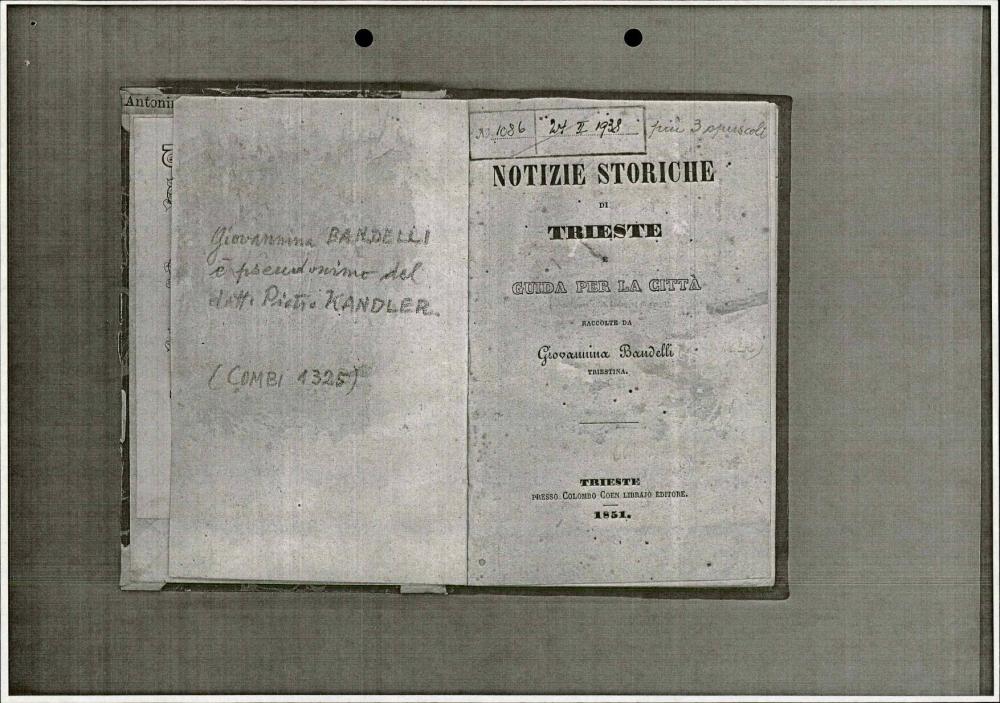 Zgodovinski vodnik po Trstu iz leta 1851, ki opisuje politično, pravno, gospodarsko in kulturno ureditev mesta v času Avstro-Ogrske, vključno z informacijami o mestni upravi, pristanišču, šolstvu, vojski in knjižnicah.