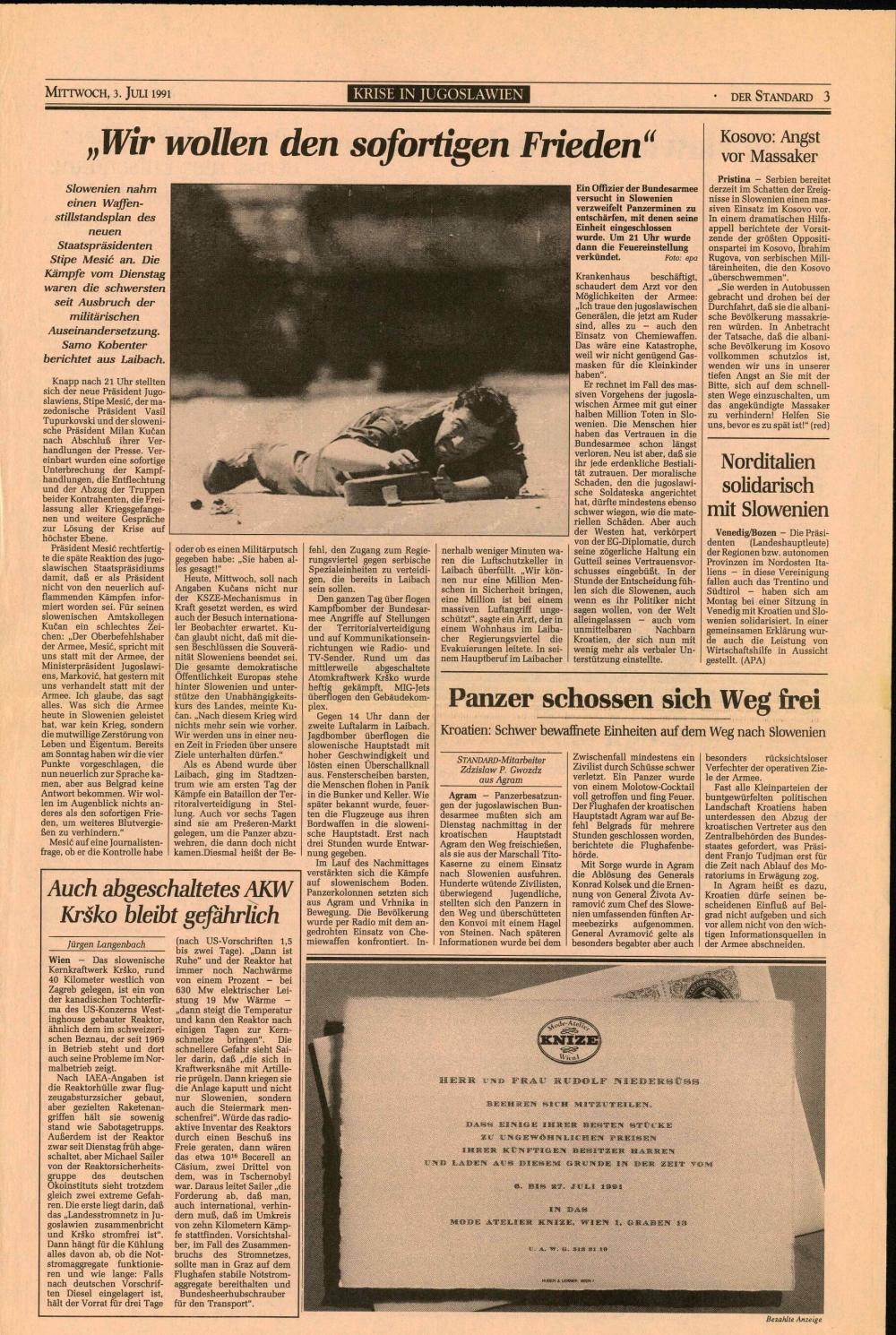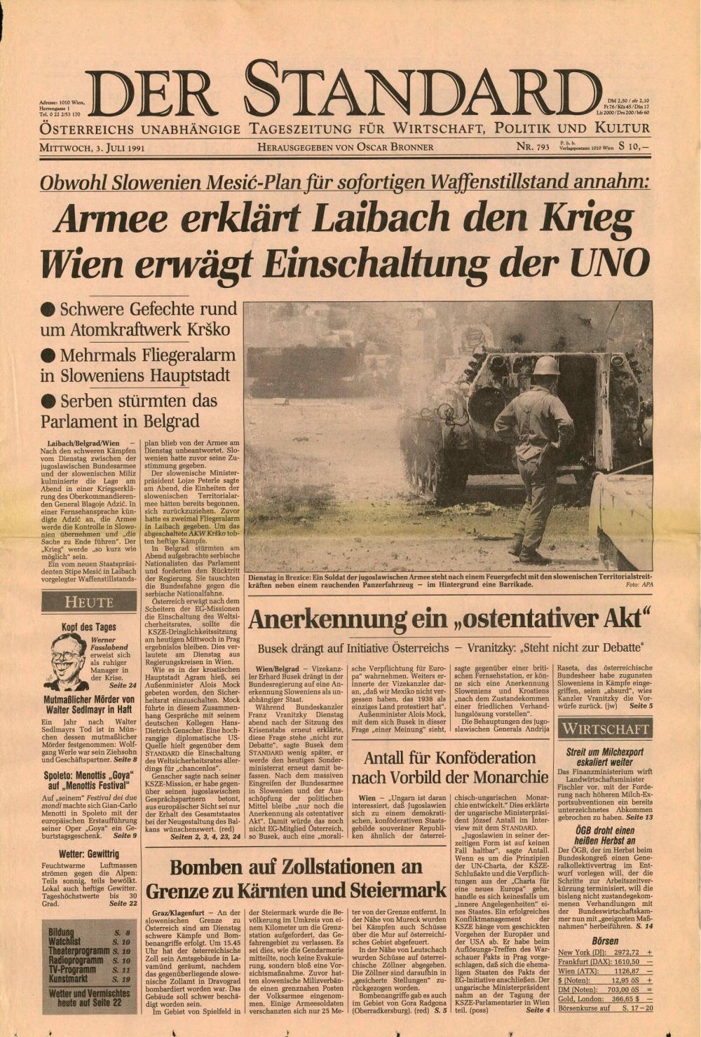 Obwohl Slowenien Mesič-Plan für sofortigen Waffenstillstand annahm: Armee erklärt Laibach den Krieg , Wien erwägt Einschaltung der UNO