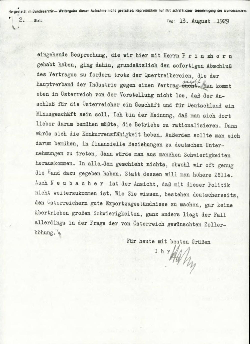 Pismo s komentarjem o gospodarskih povezavah in odnosih med Avstrijo in Nemčijo