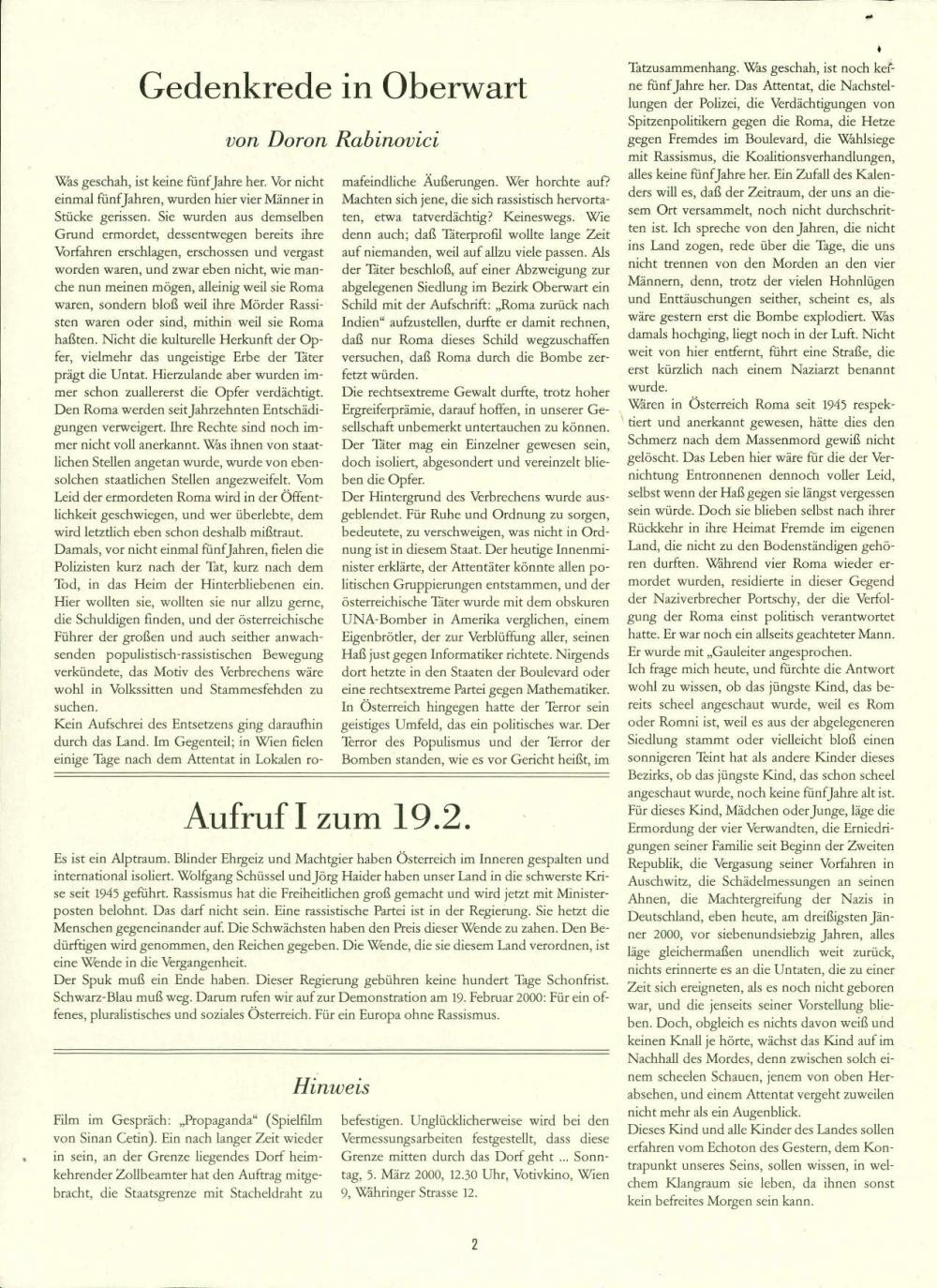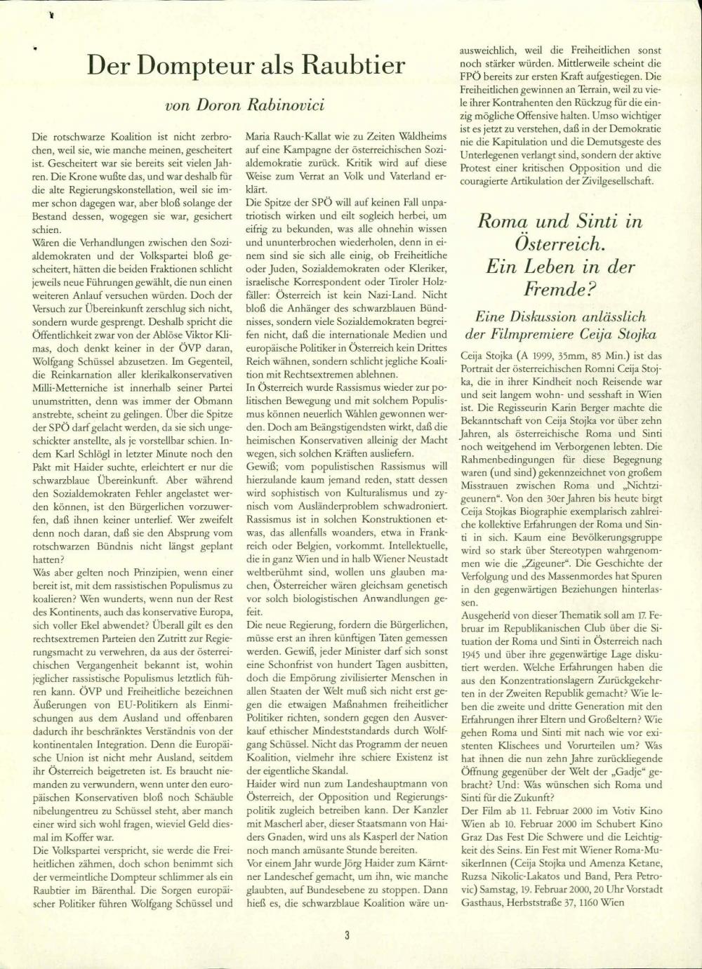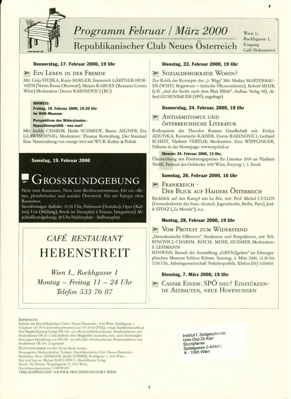 Republikanischer Club Neues Österreich Bulletin, Februar 2000