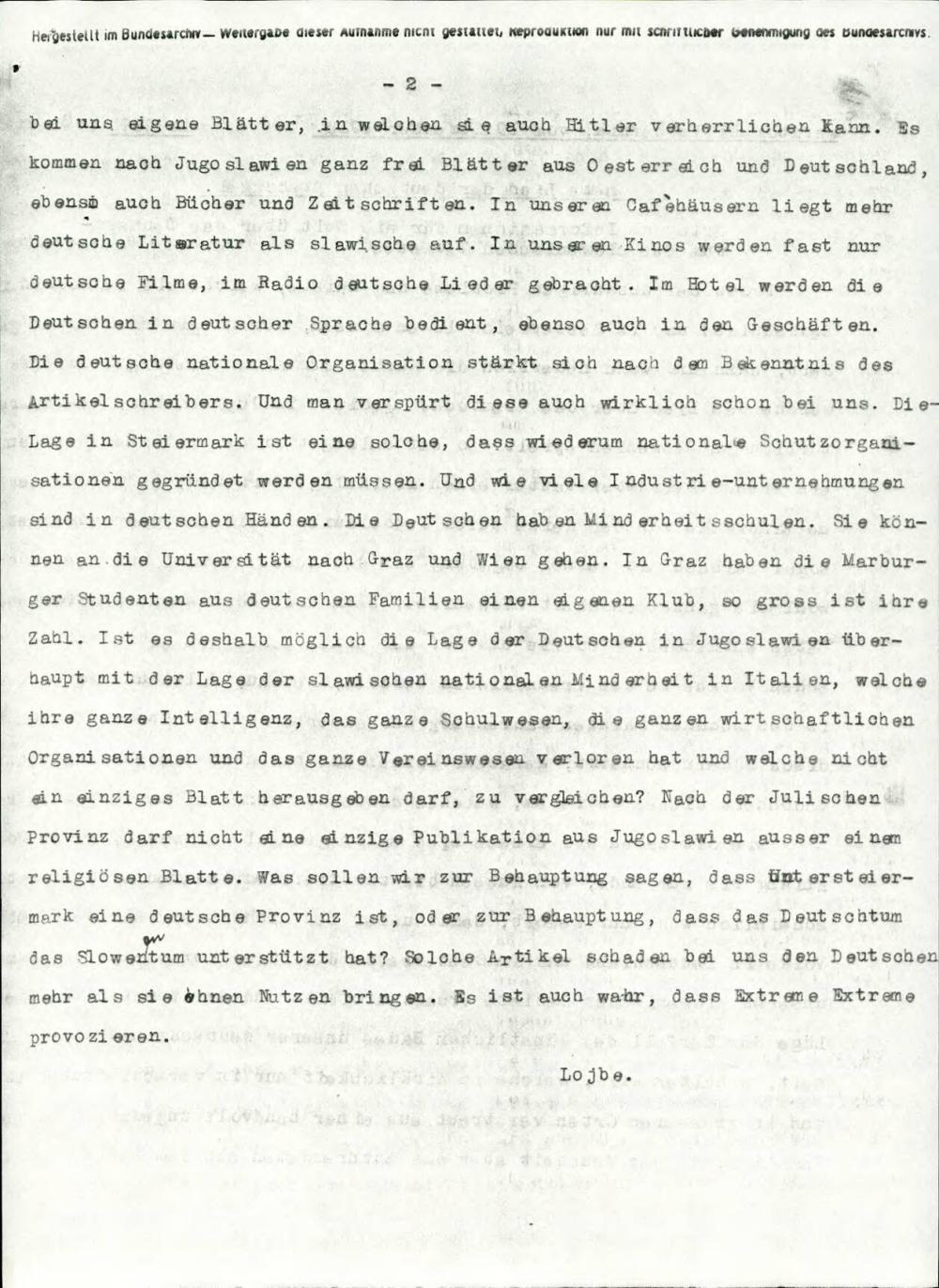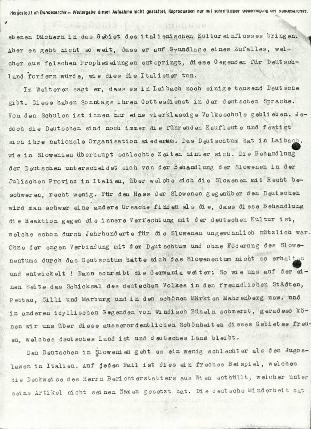 Članek iz slovenskega časopisa Ponedeljski Slovenec, ki komentira zapis 'Potovanje v Jugoslavijo' časopisa Wiener Berichterstatter, ki opisuje nemško kulturo na slovenskem ozemlju in v Jugoslaviji.