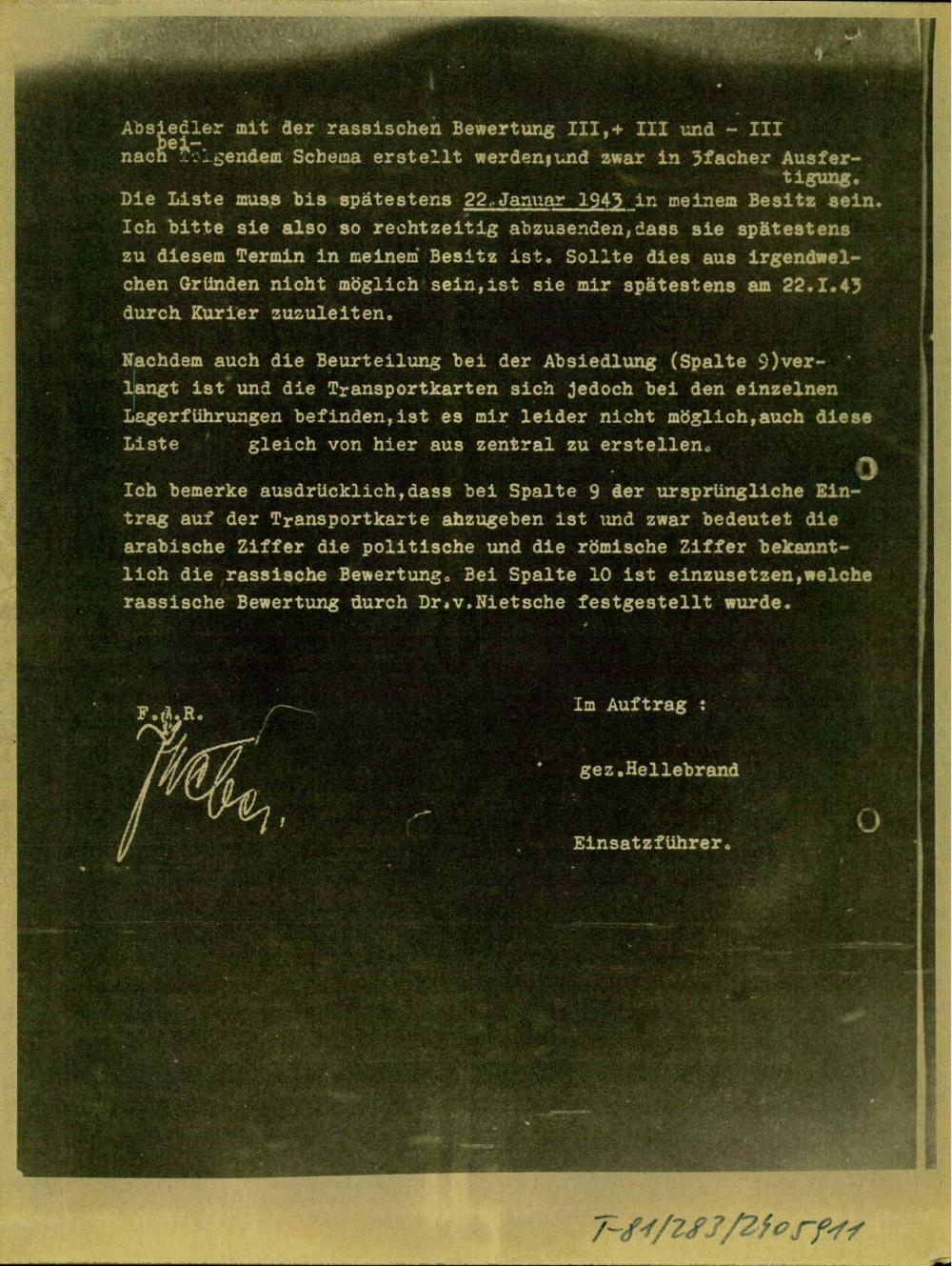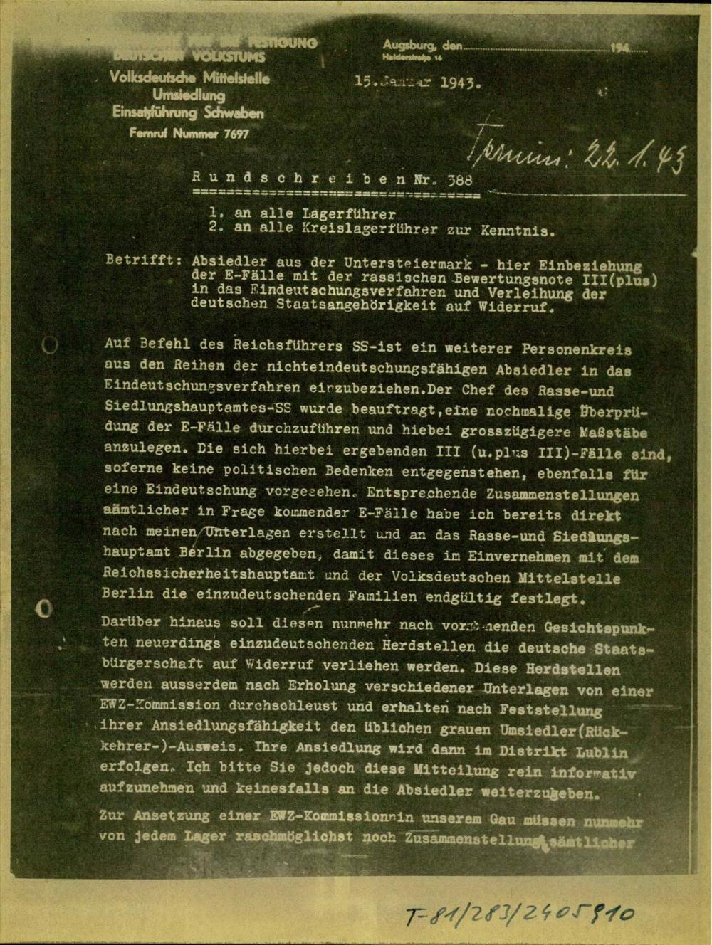 - Absiedler aus der Untersteiermark - hier Einbeziehung der E-Fälle mit der rassischen Bewertungsnote III (plus) in das Findeutschungsverfahren und Verleihung der deutschen Staatsangehörigkeit auf Widerruf (15. 1. 1943)